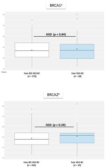In each family, the mean age at BC diagnosis of affected female relatives was calculated, considering the youngest age at diagnosis for women with multiple BC diagnoses. In no VEO-BC families, age at BC diagnosis of all affected females was considered. In VEO-BC families with only one VEO-BC cases, age at BC diagnosis of all affected females was considered, except for age at diagnosis of the female with the VEO-BC. In VEO-BC families with ≥2 women with VEO-BC diagnosed within the family, age at BC diagnosis of all affected females was considered, except for age at diagnosis of the latest VEO-BC. Families with missing data for age at diagnosis were not included in calculations.