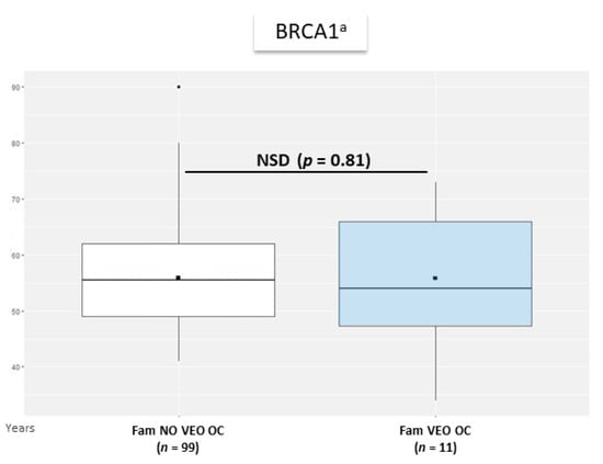 Average of mean age at OC diagnosis of female relatives of women with VEO-OC versus no VEO-OC among BRCA1m carrier women. Fam. VEO-OC: families with at least one or more VEO-OC case. Fam. NO VEO-OC: families without VEO-OC cases. (n): number of families with available data for age at first OC diagnosis in women. a: among BRCA1m carrier women. Horizontal line is median, box edges are 1st and 3rd quartile and whiskers are range of age at diagnosis of BC in relatives in each family. Central black square is the mean average age at diagnosis of BC in relatives in each family.