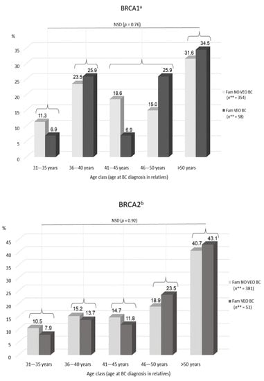 Distribution of ages at BC and OC diagnosis of relatives; comparison of families with VEO cancer and no VEO cancer. Fam. VEO-BC: families including at least one VEO-BC case; Fam. VEO-OC: families with at least one VEO-OC case; Fam. NO VEO-BC: families with no VEO-BC case; Fam. NO VEO-OC: families with no VEO-OC case. n**: Number of women with available data for age at BC diagnosis. Of note: for women with multiple BC diagnoses, the youngest age at diagnosis was considered. a: among BRCA1m carrier women. b: among BRCA2m carrier women. NSD: non-significant difference.