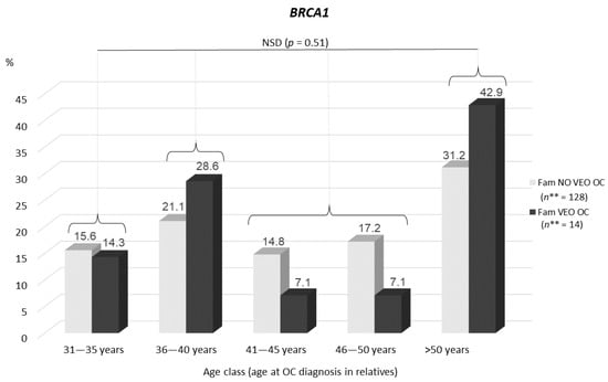 The distribution of age according to early BC diagnosis was calculated in 5-year age groups, separately for two subsets of families, VEO-BC and no VEO-BC, as the ratio of women with a diagnosis of BC in each age group to the total number of BRCAm carrier women of the family subset. A comparison of these distributions in four categories of age (age 31 to 35 years, 36 to 40, 41 to 50, >51) involved the chi-square or Fisher exact test. The calculations and comparisons were the same for VEO-OC, with the following four categories of age: 41 to 45 years, 46 to 50, 51 to 60, >61.