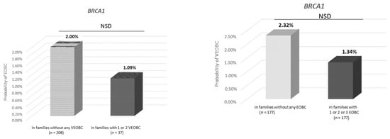 In BRCA1 families, the probability of VEO-BC in families with at least one EO-BC case diagnosed between age 31 and 35 and and no EO-BC case was 1.34% and 2.32% (difference p = 0.22). Conversely, the probability of EO-BC in families with at least one VEO-BC case diagnosed between age 31 and 35 and no VEO-BC case was 1.09% and 2.0% (difference p = 0.19).