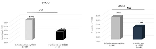 In BRCA2 families, the probability of VEO-BC in families with at least one EO-BC case diagnosed between age 31 and 35 and no EO-BC case was between 0.59% and 1.05% (difference p = 0.32). Conversely, the probability of EO-BC in families with at least one VEO-BC case diagnosed between age 31 and 35 and no VEO-BC case was between 1.09% and 2.0% (difference p = 0.76). (Figure 5 and Supplementary Table S4).