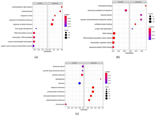 Clusterprofiler GO enrichment results showing activation or suppression of genes in Early flowering guar genotypes in comparison with Late flowering genotypes for the functional categories: (a) Biological Process (BP); (b) Molecular Function (MF); (c) Cellular Component (CC).