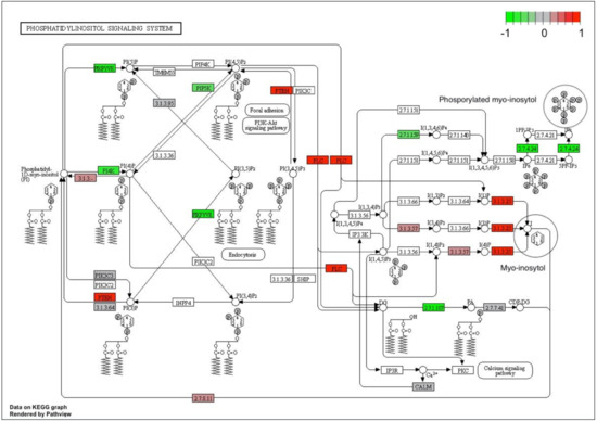 To get an insight into the interaction of myo-inositol with up/down regulation of differentially expressed transcripts we mapped differential expression data to the biochemical pathway and colored participating genes by log2fc value (Figure 4). Clusterprofiler software identifies genes as differentially expressed based on log2fc only, not taking into account their p-value. Therefore, not all DE genes colored on the phosphatidylinositol signaling pathway map (Figure 4) have a p-adjusted value < 0.05 (Table 4).
