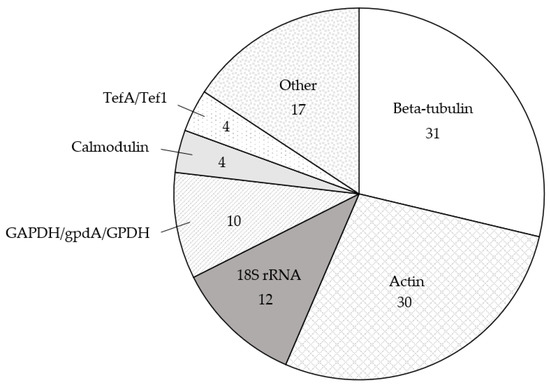 Overall, 15 species of Aspergillus were examined: A. aculeatus [34,35]; A. carbonarius [32,36,37]; A. cristatus [24]; A. fischeri [38]; A. flavus [28,39,40,41,42,43,44,45,46,47,48,49,50,51,52,53,54,55,56,57]; A. fumigatus [16,21,22,23,27,31,58,59,60,61,62,63,64,65,66,67,68,69,70,71,72,73,74]; A. luchuensis [26,75]; A. nidulans [30,76,77,78,79,80,81,82,83,84,85,86]; A. niger [87,88,89,90,91,92,93,94]; A. nomius [95]; A. oryzae [25,83,88,96,97,98,99,100,101]; A. parasiticus [29,48,50,55,102,103,104,105,106]; A. sojae [102]; A. terreus [67,68,107,108]; and A. westerdijkiae [109,110] (Table 1, Table S1). The most common reference gene used in these studies was beta-tubulin, which was used 31 times in the literature [38,41,42,46,47,48,49,50,51,52,53,54,55,56,62,63,64,65,66,67,68,69,70,76,80,81,82,83,98,106,109], followed by actin (30 times) [16,21,22,23,24,25,26,30,34,42,43,44,45,60,61,75,76,77,78,79,89,90,91,96,97,103,104,105,107,108], the 18S ribosomal RNA gene (18S rRNA; 12 times) [27,28,29,36,39,40,41,58,59,87,88,102] and glyceraldehyde-3-phosphate (GAPDH, gpdA and gpdh; 10 times) [30,31,35,52,54,60,71,90,92,110] (Table 1, Figure 1, Table S1). Reference genes that were used four or fewer times [16,27,34,37,38,41,53,57,60,70,72,73,74,82,84,85,86,93,94,95,99,100,101] are grouped under Section 2.5 of this review.