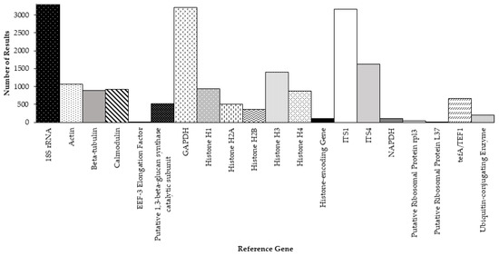 In this study, we focused our analyses on PubMed search results. However, though PubMed is a major database for the biomedical literature, there are other databases. As a broader search for RT-qPCR studies of Aspergillus fungi, we conducted an additional set of queries using Google Scholar, with the following structure: “Aspergillus “reference gene” qPCR”, where “reference gene” corresponds to the gene symbol associated with the reference gene of interest. We added quotation marks around the reference gene symbol to specifically search for the reference gene symbol as an entire string, and ensure that the substrings comprising the reference gene symbol would not be searched separately. For example, the 18S rRNA gene was queried as “Aspergillus “18S rRNA” qPCR” and not “Aspergillus 18S rRNA qPCR”. The dates of the returned results of the queries ranged from 1983 to 2021. Figure 2 summarised the search results for all reference genes reviewed in our initial PubMed searches. The Google Scholar query that returned the most results corresponded to the 18S rRNA gene, returning 3290 results total (Figure 2). This was followed by the query for GAPDH with 3209 results, ITS1 with 3170 results and ITS4 with 1630 results (Figure 2).