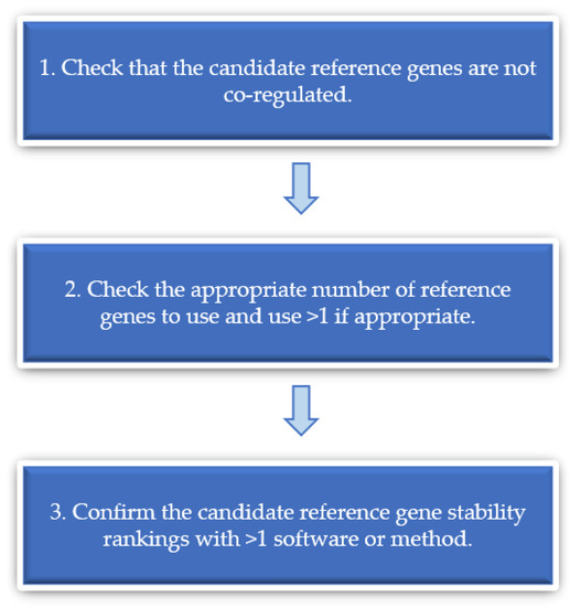 A good reference gene is one that is stably expressed under the experimental conditions being tested [19]. The Minimum Information for publication of Quantitative real-time PCR Experiments (MIQE) guidelines recommend using two or more validated reference genes to normalise gene expression data [19]. Using the geometric mean of multiple reference genes achieves high accuracy of normalisation, and is recommended over the arithmetic mean, as it better controls for differences in the amount of mRNA and outliers between genes [33]. When using multiple reference genes, it is also important to select genes that are not co-regulated, as co-regulated genes may lead to false positives as they lead to stable expression ratios [33]. Overall, inappropriate and/or insufficient reference genes can lead to the wrong interpretation of results, and reduce the reliability of experimental data [18,19]. Therefore, careful consideration should go into the selection of reference genes for RT-qPCR analysis.