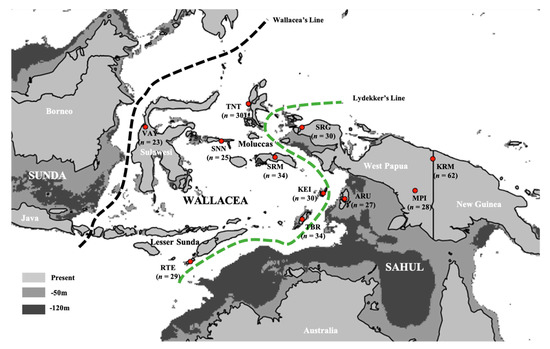Historical land coverage across study regions and sampling locations of new mitogenomes. Exposed land areas for the Sunda and Sahul continental shelves and the interceding Wallacean islands are shown for the current period (light grey) and inferred for lower sea stands occurring ~65 ka (−50 m; medium grey) and ~20 ka (−120 m; dark grey) before the current period [13]. The locations of major biogeographic boundaries separating Wallacea from the Sunda and Sahul shelves are shown as black (Wallace’s Line) and green dashed lines (Lydekker’s Line), respectively. Sampling locations (red dots) are indicated by their abbreviated population IDs (see Table S1, Supplementary Materials), with sample size indicated directly beneath.