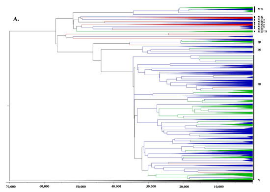 Because we are primarily interested in investigating historical migrations between Wallacea and Sahul, we merged our mtDNA samples with previously published mitochondrial sequences sourced from other Indigenous populations from Indonesia, Australia, New Guinea, and Island Melanesia, after removing all mitogenomes affiliated with either Austronesian or mainland Asiatic ancestry from our data. Because the genealogical information contained in Austronesian/Asiatic haplogroups largely arose prior to the arrival of these lineages to Wallacea or New Guinea, it captures genealogical information that is not relevant for the current study. The final combined dataset contained 656 mitogenomes and included 186 of the 351 (~53%) new samples from the West Papua and Wallacea region (see Section 3 and Tables S1 and S2, Supplementary Materials). We used MAAFT v7.407 [36] to create a multiple alignment for all 656 haplotypes to the rCRS reference. Indel removal was subsequently performed using Trimal v1.2 [37]. To reduce erroneous inferences, mitogenome regions identified as problematic on the Phylotree website were excluded from phylogenetic tree reconstruction (i.e., point mutations at positions 16,182, 16,183, and 16,519; insertions at 309.1, 315.1, and 16,193.1; and AC indels between 515 and 522 [35]).
