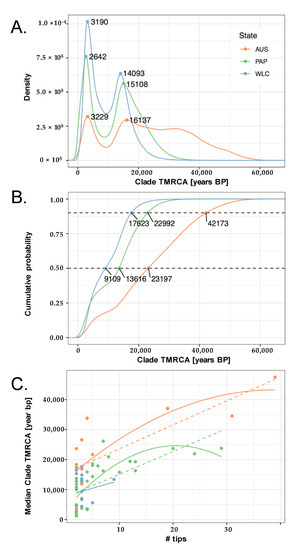 Performing this procedure on the 10,000 posterior trees produced 68 distinct GECs—35 in New Guinea, 21 in Wallacea, and 12 in Australia—with nodal support ranging from 50.9% to 99.5% (median = 88.5%; Figure 3 and Table S5, Supplementary Materials). After combining the TMRCAs from all GECs in each region, two distinct clusters occurring at ~2–3 ka and ~14–16 ka ago were clearly evident for Australia, New Guinea, and Wallacea (Figure 4A and Figure S3, Supplementary Materials). Notably, both of these modes were less pronounced for Australia, which had only two GECs (~17%) with median TMRCA <10 ka ago, and three (25%) with a median TMRCA between 10 and 20 ka ago. In contrast, all GECs from Wallacea and the majority of Papuan GECs had TMRCAs that were concentrated within these two intervals (Wallacea: ~52% <10 ka ago and ~48% between 10 and 20 ka ago; New Guinea ~34% <10 ka ago and 51% between 10 and 20 ka ago; Figure 3 and Table S5, Supplementary Materials). Accordingly, the Australian GECs had a TMRCA distribution with a substantial tail of deeper dates that was not apparent in either New Guinea or Wallacea; indeed, Wallacea had no GEC with a median TMRCA that predated 20 ka ago (oldest median TMRCA ~18 ka ago), and New Guinea only had four such GECs in total (~14%; oldest median TMRCA ~26 ka ago). This resulted in Australia having an estimated 90th percentile TMRCA (~42 ka ago) that was approximately twice as old as the comparative values observed for New Guinea (~23 ka ago) and Wallacea and (~18 ka ago) (Figure 4B). Furthermore, while the estimated TMRCA for each GEC was positively correlated with the number of individual samples observed within each GEC, the TMRCA was consistently older for Australia than both New Guinea and Wallacea after accounting for the number of samples (Figure 4C). This suggests that the tendency toward older Australian TMRCAs was not caused by differences in the distribution of GEC sizes across the three regions.