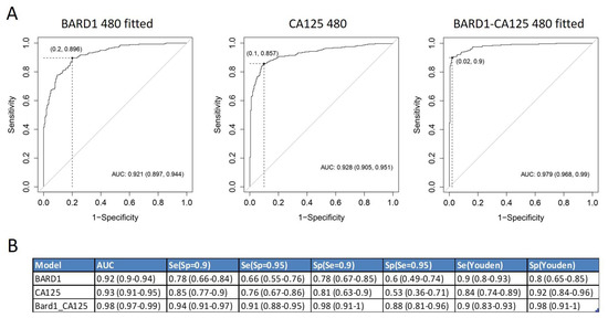 Roc curves of BARD1 480-sample-fitted model, compared to CA125 and BARD1-CA125 480-sample-fitted model: (A) ROC curves for BARD1 480-sample-fitted model, CA125, and BARD1-CA125 480-sample-fitted model are shown with optimal cut-offs (Youden); (B) the specificity and sensitivity values for BARD1 480-sample-fitted (BARD1), CA125, and BARD1-CA125 are shown for different cut-offs. Se (sensitivity), Sp (specificity), AUC (area under the ROC (receiver operator characteristic) curve).