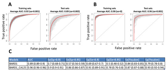 Similarly, we performed cross-validation by building BARD1-CA125 fitted models on 200 training sets and applying them on 200 validation sets (Figure 2B). The average ROC curve AUC was 0.98 for training sets and 0.96 for test sets. The sensitivity based on the average ROC curve of the validation sets was 0.86 at the specificity cut-off of 0.95 (Figure 2C). The range of the AUCs of the different ROC curves of the test sets was much smaller for the BARD1-CA125 models than for the BARD1 peptides models.