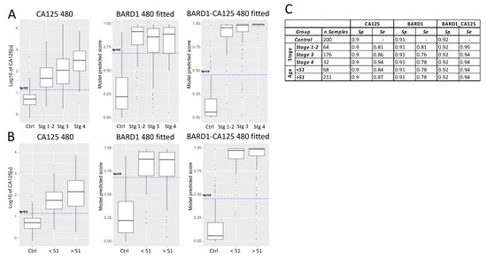 Sensitivity analysis of CA125, BARD1 480-sample-fitted model, and BARD1-CA125 480-sample-fitted model for different ovarian cancer stages: (A) the CA125 values (log10 scale) or the scores predicted by BARD1 480-sample-fitted and BARD1-CA125 480-sample-fitted models are shown for controls and cancer stages. The cut-off was fixed at specificity 0.9 (dashed line); (B) comparison of sensitivity of CA125, BARD1 480-sample-fitted model, and BARD1-CA125 480-sample-fitted model by age group of <51 and >51 (51 and more); (C) the specificity and sensitivity values for groups of age are shown for specificity =0.9 cut-off.