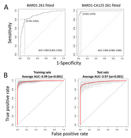 ROC curves for BARD1 261 -sample-fitted and BARD1-CA125 261-sample-fitted models: (A) ROC curves for BARD1 261-sample-fitted and BARD1-CA125 fitted models with optimal cut-offs (Youden) are shown; (B) the respective ROC curves of BARD1-CA125 models obtained for 200 training and 200 (left) validation sets (right), performed as for Figure 2, are presented, and average ROC curves are marked red.