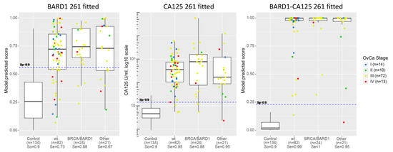 The efficacy of the models was determined for prediction of OC in subgroups of the 261 cohort, patients with or without BRCA1/2 or other mutations, or healthy women (Figure 5). CA125 showed higher sensitivity (shown at the cut-off of specificity 0.9) for the no-mutation (wt) OC group and the “other” OC group than the BRCA1/2 or BARD1 mutation group. CA125 also showed higher sensitivity than the BARD1 261 fitted model. The BRCA1/2 or BARD1 mutation group showed equally high sensitivity with both CA125 and BARD1 261-sample-fitted models. However, the BARD1 261-sample-fitted model showed the highest sensitivity for the BRCA1/2 or BARD1 mutation group. Importantly, the BARD1-CA125 261-sample-fitted model reached a sensitivity of 0.99 for the no-mutation (wt) and “other” groups (other than BRCA1/2 or BARD1 group of OC) and a sensitivity of 1 for the ovarian cancers with BRCA1/2 or BARD1 mutations.