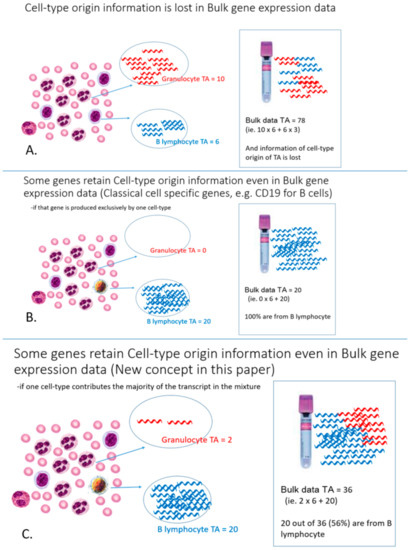 A mathematically based methodology (known as deconvolution) has been used to determine the proportional cell counts of various subpopulations in cell mixtures, which requires a long list of signature genes for each subpopulation [14,15,16]. However, the primary motivation of deconvolution is fundamentally different from our method. Our primary objective is to determine TA of genes of a leukocyte subpopulation of interest, whereas the proportional cell count of a subpopulation was the primary target in deconvolution.