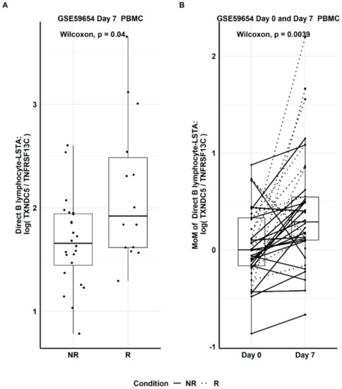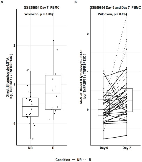 With this new B lymphocyte biomarker available (Table 4), it is now possible to estimate the expression of B lymphocyte as a response to vaccination using the other expression datasets with only PBMC samples available (see the list in Table 1). Dataset GSE59654 (influenza vaccine) was used as an exploratory dataset to detect any differential gene expression (as determined by Direct LS-TA) on Day 7 between the two groups (i.e., R and NR groups). This dataset was selected because it had the largest sample size. Figure 4A shows that R had a significantly higher level of Direct B lymphocyte LS-TA of TNFRSF17 than that of NR (Wilcoxon test, p-value = 0.037). Similarly, the increment of Direct B lymphocyte LS-TA of TNFRSF17 from the day of vaccination (Day 0) to Day 7 was also significant in a paired Wilcoxon test (Figure 4B, p-value = 0.024).