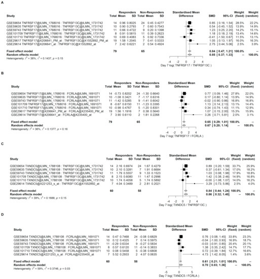 Meta-analysis of the Day 7 results of Direct B lymphocyte-LSTA of TNFRSF17 and TXNDC5 using TNFRSF13C or FCRLA as a reference gene in PBMC datasets. Day 7 Direct B lymphocyte-LSTA was significantly higher among the responder groups with an overall effect SMD of 0.6 to 0.8. The specific probe sets used in the calculation of Direct LS-TA are also shown in the table following the gene symbols. (A,B) are the results of Direct LS-TA of TNFRSF17 using two different B lymphocyte reference genes (TNFRSF13C and FCRLA). (C,D) show the Direct LS-TA results of TXNDC5. The specific probe sets used in the calculation of Direct LS-TA are also shown in the table following the gene symbols.
