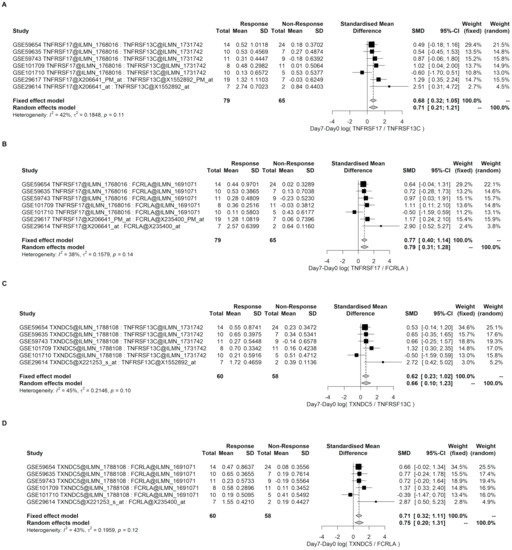 Meta-analysis of the differential increment from Day 0 to Day 7 of Direct B lymphocyte-LSTA between R and NR groups. (A,B) are the results of the differential increment of Direct LS-TA of TNFRSF17 using two different B lymphocyte reference genes (TNFRSF13C and FCRLA). (C,D) are the results of the differential increment of the Direct LS-TA results of TXNDC5. Direct B lymphocyte-LSTA showed significantly higher increments among the responders with an overall effect SMD of between 0.62 to 0.77. The specific probe sets used in the calculation of Direct LS-TA are also shown in the table following the gene symbols.