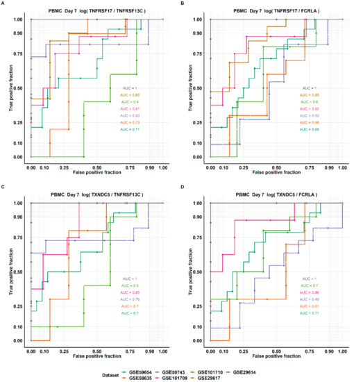 ROC curves of Day 7 Direct B lymphocyte LS-TA of TNFRSF17 (A,B) and TXNDC5 (C,D) using two different B lymphocyte informative reference genes (TNFRSF13C and FCRLA). The performance of the single cell-type biomarker parameters was analyzed by ROC with responder as a positive outcome.