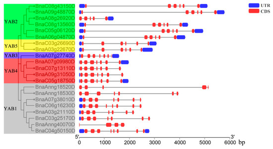 The encoded proteins were 158 to 247 amino acids in length, with a predicted molecular weight (MW) ranging from 17.9 and 27.8 kDa and a pI between 5.5 and 9.95. The coding sequences of members of the YAB1 and YAB2 subgroups were on average longer than for the other subgroups: the coding sequences of BnaYAB1 were between 1806 and 5159 bp, while those of BnaYAB2 ranged from 1375 to 5795 bp. By contrast, the coding sequence of BnaYAB3 was 1594 bp, and those of the four BnaYAB4 members were between 1663 and 1978 bp; the coding sequences of the two BnaYAB5 members were 2933 and 3086 bp (Table S4).