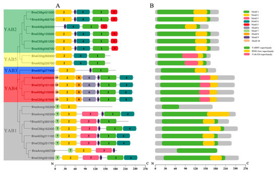 Analysis of protein motifs and conserved domains in B. napus YABBY proteins. (A) Protein motifs. Conserved motifs in the 21 BnaYAB proteins, arranged based on their phylogenetic positions. Weblogo plots of the ten conserved motifs are shown in Figure S1. (B) Conserved domains. Conserved domains are represented by different colored boxes.
