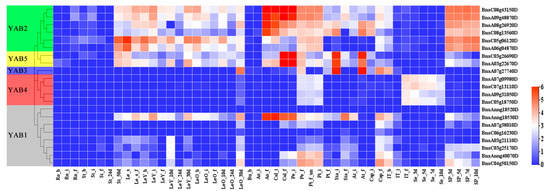 We determined the expression pattern of YABBY genes by analyzing a public transcriptome dataset of B. napus cultivar ZS11, including roots, stems, young leaves, old leaves, buds, flower stalks, sepals, petals, unpollinated pistils, pistils, stamens, anthers, filaments, seeds, and siliques (Table S6). The expression patterns of most BnaYAB genes are tissue-specific (Figure 6 and Table S7). For example, BnaYAB genes are seldom expressed in rhizomes, while most BnaYAB1 and BnaYAB4 subfamily members showed little or no expression in each tissue over the course of their development. BnaYAB2, BnaYAB3, and BnaYAB5 were expressed in various tissues at the flowering stage, indicating that they may regulate the development of flowers. With the exception of BnaAnng18530D, which is highly expressed in various tissues during flowering, the remaining BnaYAB1 members were barely expressed in most tissues (Figure 6 and Table S7). Most members of the BnaYAB2 subfamily shared the same expression pattern, with high expression in flower tissues and siliques. The two BnaYAB5 members, BnaA03g22670D and BnaC03g26690D, also exhibited the same expression pattern. The expression patterns of BnaYAB genes were thus largely consistent with their locations along the phylogenetic tree (Figure 1). These results indicate that most BnaYAB genes are tissue-specific and that related genes exhibit similar expression patterns (Figure 1 and Figure 6).
