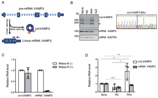 From the analysis of RNA-sequencing data produced in our laboratory (GEO: GSE117609) [24], we detected both the circular and linear VAMP3 isoforms in human primary myoblasts, embryonal rhabdomyosarcoma (ERMS) RD cells and alveolar rhabdomyosarcoma (ARMS) RH4 cells. To validate their expression, we performed RT-PCR in all the three cell lines using specific divergent primers facing circVAMP3 back-splicing junction (BSJ) or specific convergent primers for VAMP3 linear mRNA (Figure 1A). The RT-PCR amplicon corresponding to the circular form (indicated by the arrow in Figure 1B, left panel) was purified and submitted to Sanger sequencing. The results of the sequencing confirmed the presence of the BSJ in the circVAMP3 amplicon, confirming the circularization of the RNA (Figure 1B, right panel). The slower migrating band (indicated by an asterisk in Figure 1B, left panel) was also sequenced and resulted to correspond to concatemers amplification likely originating by the reverse transcription of the circular molecule.