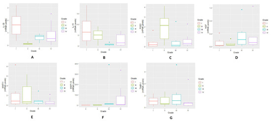 MMP-2 level in OA SF samples followed a trend like MMP-1 and MMP-13; the highest MMP-2 was found in KL grade-III samples (average—8.92 pg/mL). The least MMP-2 was noted in KL grade-I SFs (average—2.70 pg/mL). A noteworthy difference in MMP-2 was observed between KL grade-I and II (p = 1.71 × 10−3; p < 0.001), KL grade-I and III (p = 3.61 × 10−8; p < 0.001) and between KL grade-I and IV (p = 1.86 × 10−5, p < 0.001). An outstanding difference was found in between KL grades-II and III (p = 7.40 × 10−4; p < 0.001); however, the difference between KL grades-II and IV (p = 0.1148841) and KL grade-III and IV (p = 0.4928022) was not significant (Figure 2D).