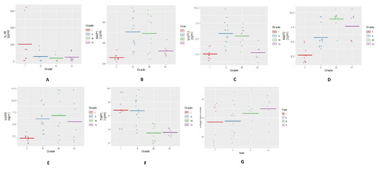 To explore a functional relationship between IL-1β, a key OA cytokine and MMPs, a correlation matrix was plotted using a cumulative mean value (mean of all grades) estimated from SF for each selected marker (Figure 5). It revealed a strong negative correlation between IL-β and MMPs. In particular, the cytokine showed a strong negative correlation with MMP-9 (correlation coefficient: −0.98) and MMP-2 (correlation coefficient: −0.92). A moderate negative correlation was found between IL-1β and MMP-1 (correlation coefficient: −0.74) and between IL-1β and MMP-13 (correlation coefficient: −0.52). The matrix also showed a strong positive correlation between MMP-1 and MMP-13 (correlation coefficient: 0.96) as well as between MMP-2 and MMP-9 (correlation coefficient: 0.90).