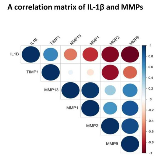Correlation matrix of IL-1β, MMP-1, MMP-13, MMP-2, MMP-9 and TIMP−1. The matrix was developed using a cumulative mean value (mean of all grades) estimated from SF for each selected marker. It revealed a negative correlation between—IL-β and MMP-1 (correlation coefficient: −0.74); IL-1β and MMP-2 (correlation coefficient: −0.92); IL-1β and MMP-9 (correlation coefficient: −0.98); IL-1β and MMP-13 (correlation coefficient: −0.52); It showed a strong positive correlation between MMP-1 and MMP-13 (correlation coefficient: 0.96) as well as between MMP-2 and MMP-9 (correlation coefficient: 0.90).