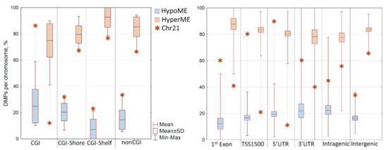 Plots depict the percentage of hypermethylated and hypomethylated DMPs of chromosome 21 relative to the corresponding characteristics of other autosomes; the percentages across different regions—CGIs (left) and genic regions (right)—are shown. The values for chromosome 21 are marked by asterisks. Boxplots show the statistics for the distribution of the percentage of hypermethylated and hypomethylated DMPs—the mean value, maximum, and minimum—for all autosomes except chromosome 21.