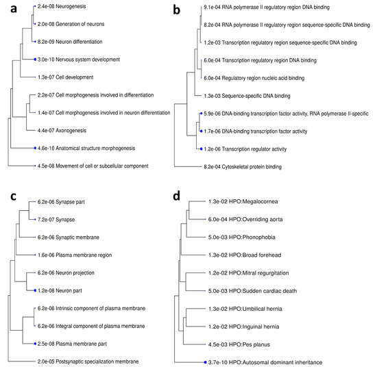 Hierarchical clustering trees summarizing the results of the Gene Ontology—GO:Biological Process (a), GO:Molecular Function (b), and GO:Cellular Component (c)—and Human Phenotype Ontology (d) overrepresentation tests performed for the set of genes differentially methylated (DMGs) in DS (Table S4). The trees were constructed using ShinyGO tools [25]. The top 10 GO terms overrepresented in the DMGs set ranged by the enrichment p-value are shown. Functional categories are clustered based on the number of shared genes; bigger dots indicate more significant p-values.