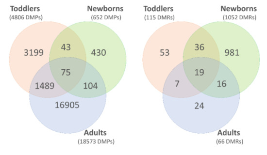 The distribution and overlapping of differentially methylated positions (DMPs; left) and differentially methylated regions (DMRs; right) identified in three epigenome-wide association studies in the individuals with Down syndrome of different ages: newborns [8], toddlers (current study), and adults [6].