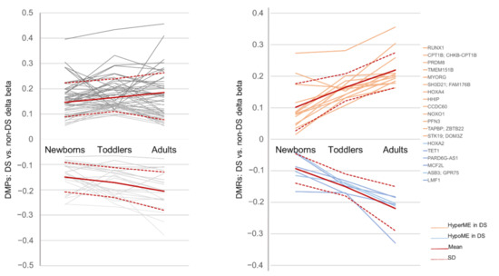 Plots depict DS-associated methylation signals—75 DMPs (left) and 19 DMRs (right)—consistently detected in the blood cells of individuals with DS across three age groups. The Y-axis shows the mean delta-beta of DS vs. non-DS individuals; the positive and negative values of the mean delta-beta correspond to the hypermethylation and hypomethylation events in DS, respectively. The delta-beta average by age group marked by the red line indicates the main trend of longitudinal change in DS-associated differential methylation.