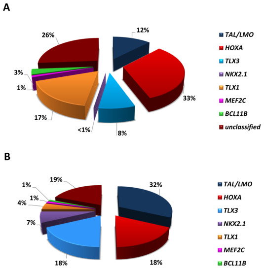 According to their reciprocal distribution and effects of their deregulation, T-ALL-related abnormalities can be distinguished as type A and type B [4]. Type A abnormalities are mutually exclusive and cause the up-regulation of (onco)genes coding for transcription factors critical in hematopoiesis and/or T-cell development, maturation, and differentiation. These genetic events mark distinct subgroups, i.e., TAL/LMO, HOXA, TLX3, TLX1, NKX2-1/2-2, MEF2C, allowing the molecular classification of at least 70% of T-ALL cases, with different distribution in children and adults (Figure 2) [5,6,7,8,9]. Type B abnormalities, on the other hand, involve genes that code for different protein families, such as epigenetic factors, tyrosine kinases, ribosomal proteins, and proteins that belong to signaling pathways. They are distributed across all genetic subgroups, albeit not randomly, as privileged associations occur between primary and secondary genetic changes. Thus, concurrent primary and secondary events trace unique leukemogenic pathways that rely on specific cooperative activities.