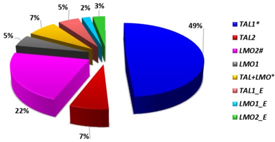 First identified by Ferrando A et al. [5], TAL1 overexpression characterizes 30–45% of pediatric and 10–15% of adult T-ALL (Figure 2). These T-ALL harbor chromosomal rearrangements, or alternatively noncoding sequence mutations, which cause the activation of members of the basic helix-loop-helix (bHLH) family of transcription factors (TAL1 and TAL2) and/or of the LIM-only domain (LMO1, LMO2, and LMO3) proteins [8,11,12,13]. TAL and LMO proteins belong to the same transcriptional complex and are frequently co-deregulated in T-ALL, suggesting a cooperative role in T-leukemogenesis. Consistent with this model, the oncogenic activity of LMO1 or LMO2 is markedly enhanced by TAL1, in transgenic mice [14,15]. TAL and LMO leukemogenic activity, demonstrated in in vitro and in vivo studies, was the consequence of the altered expression of their downstream targets, such as TRIB2, NKX3.1, RUNX1, GATA3, and MYB [16,17].