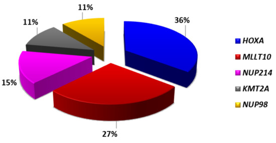 The first evidence of an oncogenic role of HOXA genes in T-ALL pathogenesis was highlighted by gene expression profile through the identification of a distinct subgroup of T-ALL with high HOXA expression [6]. HOXA positive T-ALL harbored a wide spectrum of different genomic abnormalities affecting HOXA itself, KMT2A, or MLLT10, indicating different mechanisms of cis or trans activation of the HOXA cluster genes can occur [6,30,31]. Further enriching the HOXA T-ALL subgroup, there are abnormalities of two promiscuous shuttling nucleoporins, i.e., NUP98 or NUP214, which represent additional mechanisms of HOXA activation in both pediatric and adult T-ALL (Figure 6) [32,33,34]. Although usually mutually exclusive, concomitant rearrangements of the HOXA and MLLT10 genes have been reported in rare cases of T-ALL [8,35].