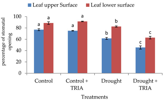 Effect of TRIA (35 ppm) treatment on percentage of stomatal openings on both the upper and lower surface of leaves of drought-stressed rice. Each value is the mean of three replicates ± SE. Columns with different letters are significantly different at p ≤ 0.05.