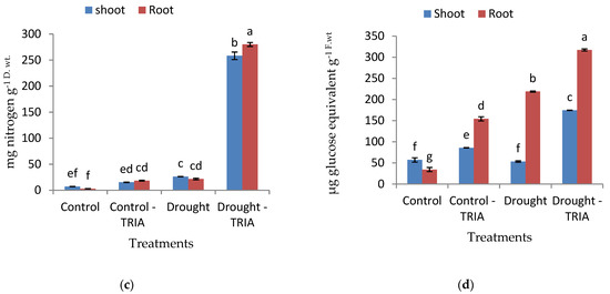 Meanwhile, the total soluble sugars recorded a non-significant decrease and a significant increase in the shoots and roots of drought-stressed seedlings, respectively (Figure 3d). On the other hand, TRIA treatment of drought-stressed rice seedlings led to a significant increase in ABA, proline, amino acids, and total soluble sugar contents in both the shoots and roots (Figure 3a–d).