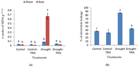 Effects of TRIA (35 ppm) treatment on (a) malondialdehyde (MDA) content and (b) the percentage of electrolytes leakage (EL) of drought-stressed rice seedlings. Each value is the mean of three replicates ± SE. Columns with different letters are significantly different at p ≤ 0.05.