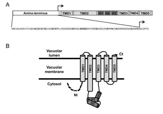 Opposite to animals, yeast cells do not express ferritin; instead they accumulate iron in the vacuole for detoxification and storage purposes [7]. Iron can enter yeast vacuoles by endocytosis and via Ccc1, a protein that localizes to the vacuolar membrane and transports iron into its lumen [8,9]. Since yeast cells cannot excrete iron, Ccc1 constitutes the main yeast iron detoxification and resistance factor. Thus, yeast cells lacking CCC1 (ccc1Δ mutants) are highly sensitive to elevated levels of environmental iron [8,10]. With the exception of animals, Ccc1 homologs are present in many organisms, including bacteria, protists, fungi, and plants, where they are denoted VIT1 proteins (reviewed in [11]). The resolution of the crystal structure of Eucalyptus grandis VIT1 ortholog (EgVIT1) made possible the identification of essential and conserved motifs required for metal transport, as well as other species-specific domains [11,12]. According to EgVIT1 structure and protein alignments, Ccc1/VIT1 proteins, including yeast Ccc1, possess five transmembrane domains (TMDs), a metal-binding loop containing three alpha helixes (H1–H3) between TMD2 and TMD3 that faces the cytosol, a cytosolic amino-terminal (Nt) region, and a vacuolar carboxyl terminus (Figure 1) [12]. Structure-function data in EgVIT1 also suggest that Ccc1/VIT1 proteins dimerize and function as H+ antiporters for Fe2+ [12]. The Ccc1/VIT1 cytosolic Nt domain is not conserved and displays different properties depending on the species [11]. Yeast possesses a cytosolic Ccc1 Nt with serine and lysine residues that have been identified in proteomic studies as phosphorylated and ubiquitylated, respectively [13,14]. Moreover, Malaysian wild S. cerevisiae strains harboring a mutation in their Nt region (G22R) are sensitive to high iron concentrations [15]. Thus, although according to conservation features the Nt domain of yeast Ccc1 seems dispensable, it may be important for regulatory functions.