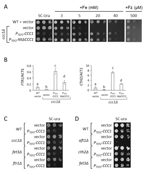 Toxicity of CCC1 constitutive expression under iron-sufficient conditions is rescued by iron addition or by deleting the Ccc1 cytosolic amino-terminal region. BY4741 (WT) cells were transformed with p416TEF (vector), and ccc1Δ cells were transformed with p416TEF (vector), p416TEF-CCC1 (PTEF2-CCC1), and p416TEF-NtΔCCC1 (PTEF2-NtΔCCC1) plasmids. (A) Expression of CCC1 altered growth in media with different iron availability. Cells were cultivated overnight in SC-Ura and then spotted on SC-Ura media containing different concentrations of FAS (Fe) or ferrozine (Fz). (B) FTR1 and CTH2 mRNA levels. Yeast cells were cultivated in SC-Ura + 500 μM FAS for 6 h. Total RNA was extracted and the levels of particular mRNAs were determined by RT-qPCR. ACT1 was used to normalize data. Three independent biological replicates were performed and the average and standard deviation were determined relative to the WT. Different letters above the bars represent statistically significant differences (p-value < 0.05). (C,D) Deletion of the high-affinity iron uptake system did not rescue CCC1 overexpression toxicity. BY4741 (WT), ccc1Δ, fet3Δ, ftr1Δ, aft1Δ, and cth2Δ cells transformed with p416TEF (vector) or p416TEF-CCC1 (PTEF2-CCC1) were spotted on SC-Ura. Plates were incubated at 30 °C and photographed.