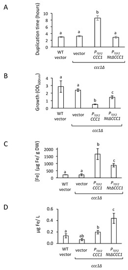 Overexpression of NtΔCCC1 improves iron extraction from media. (A) Yeast cells described in Figure 2 were inoculated at an OD600nm of 0.2 in SC-Ura with 500 μM FAS in a 96-well microplate reader and duplication times were calculated from the resulting growth curves as described in Materials and Methods. (B–D) Yeast cells described in Figure 2 were cultivated in SC-Ura + 500 μM FAS for 6 h, and OD600nm (B), μg Fe/g dry weight (DW) (C), and μg Fe/L of medium (D) were determined. Three independent biological replicates were performed. The average and standard deviation were determined. Different letters above the bars represent statistically significant differences (p-value < 0.05).