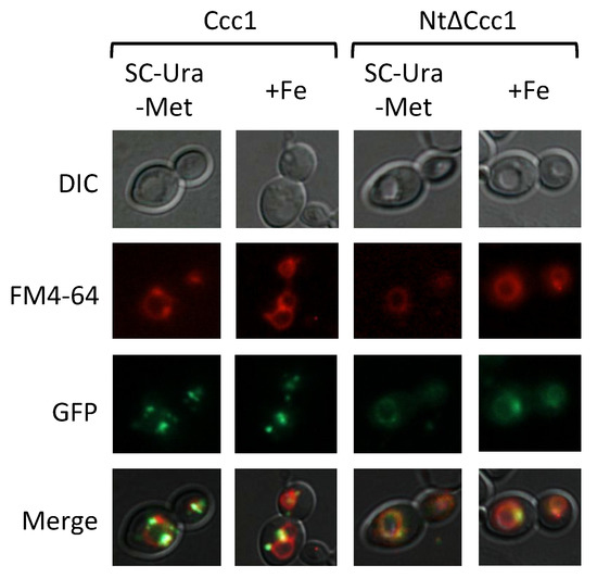 Subcellular localization of Ccc1 and NtΔCcc1 proteins in normal (SC-Ura-Met) and high-iron (+Fe) conditions. Yeast cells were cultivated as described in Figure 5, and visualized under Nomarski (DIC) and GFP fluorescence optics. Vacuolar membranes were stained with the styryl dye FM4-64 as indicated in Materials and Methods. Merge shows the overlap of the different signals.