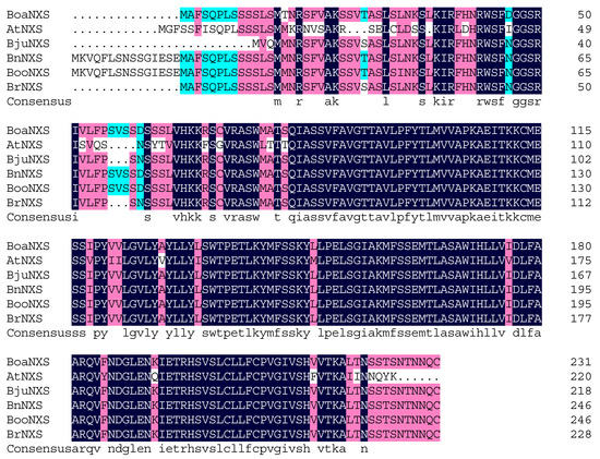 Multiple sequence alignment of NXS from different plants. Alignment of the protein sequence of BoaNXS with selected homologs. The alignment was performed using DNAMAN software. The amino acids with 100% identity are shown with a black background, those with ≥75% identity are shown in red, and those with ≥50% identity are shown in blue. The species and their accession numbers in GenBank (Brassica oleracea var. alboglabra (Boa): BoaNXS (MW284390), Arabidopsis thaliana (At): AtNXS (VYS50248.1), Brassica juncea (Bju): BjuNXS (BjuA007212), Brassica napus (Bn): BnNXS (XP_013676374.1), Brassica oleracea var. oleracea (Boo): BooNXS (XP_013618475.1), Brassica rapa (Br): BrNXS (XP_009127521.1) are listed here.