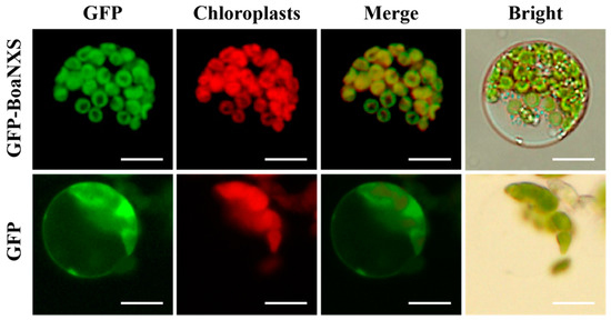 WoLF PSORT software predicted that BoaNXS was most likely to be located in the chloroplast. A clear GFP fluorescence signal of BoaNXS was only detected in the chloroplast (Figure 3), and the expression of the GFP protein was detected in the entire protoplast with green fluorescence signal in the control. These results indicated that BoaNXS was specifically localized in the chloroplast, which was consistent with the software prediction.