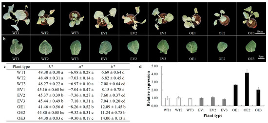 BoaNXS-overexpressed plants were yellow-green compared to the dark-green of the control (the wild-type (WT) plants) and agroinfiltrated plants with empty vector (EV) (Figure 4a,b). The red-green value a* was significantly lower for BoaNXS-overexpressed plants than for control and EV plants (Figure 4c), indicating that the leaves of the overexpressed plants were greener. Moreover, the yellow-blue value b* was significantly lower for BoaNXS-overexpressed plants than for control and EV plants (Figure 4c), indicating that the leaves of the overexpressed plants were yellowing. The BoaNXS gene expression levels of OE plants were 2.10- to 4.24-fold higher than those in WT and EV plants, especially in OE2 (Figure 4d).