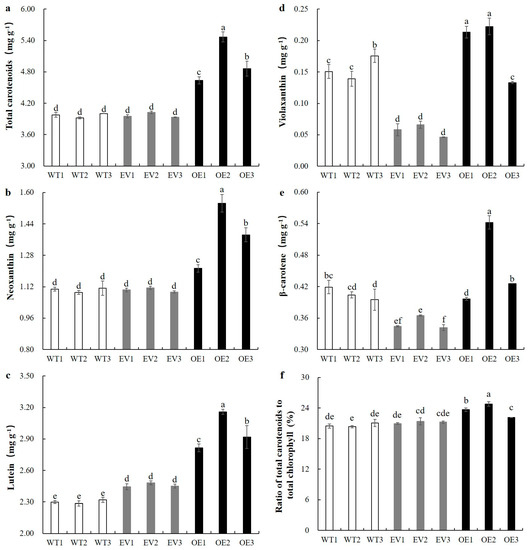 The content of total carotenoids was significantly increased in all three overexpressed plants (OE1, OE2, and OE3) (Figure 5a). The average content of total carotenoids in overexpressed plants was 4.99 mg g−1 DW, which was 1.26-fold higher compared with the average content of the control plants. Four carotenoids were detected in Chinese kale leaves: neoxanthin, violaxanthin, lutein, and β-carotene. The content of neoxanthin and lutein was significantly higher in all three overexpressed plants than in both WT and EV plants (Figure 5b,c), whereas violaxanthin content in OE1 and OE2 leaf tissues (Figure 5d), as well as β-carotene content in OE2 leaf tissue (Figure 5e), was significantly higher compared with that in WT plants. Although there were significant differences in the content of several individual carotenoids (violaxanthin, lutein, and β-carotene) between WT and EV plants, the content of total carotenoids did not significantly differ between WT and EV plants. Among the overexpressed plants, OE2 leaf tissue had the highest total and individual carotenoids (neoxanthin, violaxanthin, lutein, and β-carotene), which were up to 1.38, 1.40, 1.38, 1.37, and 1.32-fold higher compared with the average level of WT plants, respectively. The ratio of total carotenoids to total chlorophyll is also shown in Figure 5f, and the results are basically consistent with the color analysis results (Figure 4).