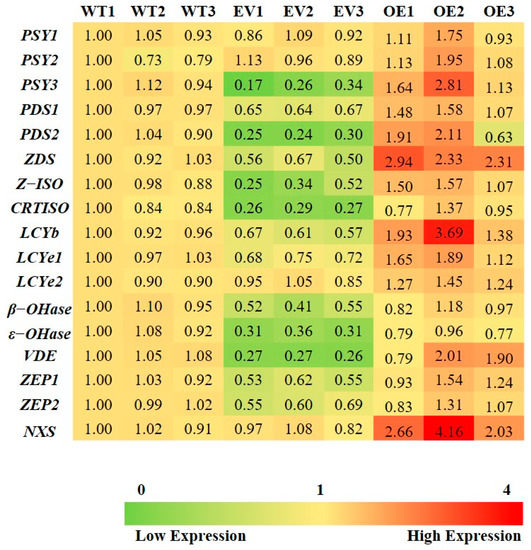 Heat map of carotenoid biosynthetic gene expression in wild-type (WT), the agroinfiltrated plants with empty vector (EV), and the BoaNXS-overexpressed plants (OE) in Chinese kale. Samples of leaves were taken from the control (WT), EV, and OE plants at the second day after the last injection. Abbreviations: GGPP, geranylgeranyl diphosphate; PSY, phytoene synthase; PDS, phytoene desaturase; ZDS, ζ-carotene desaturase; Z-ISO, ζ-carotene isomerase; CRTISO, carotenoid isomerase; LCYe, lycopene ε-cyclase; LCYb, lycopene β-cyclase; ε-OHase, ε-carotene hydroxylase; β-OHase, β-carotene hydroxylase; VDE, violaxanthin de-epoxidase; ZEP, zeaxanthin epoxidase; NXS, neoxanthin synthase.